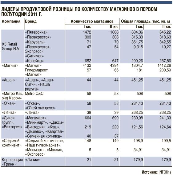 По итогам первого полугодия 2011 года Х5 Retail Group не смогла сохранить лидирующие позиции в России по объему торговых площадей. Согласно данным INFOline, вперед вырвался «Магнит» с показателем 1,612 млн кв. м, что всего на 8 тыс. кв. м больше, чем у конкурента (см. таблицу). Это соответствует прогнозам аналитиков, которые на основе данных за 2010 год предрекали победу краснодарскому ритейлеру уже в первой половине текущего года.