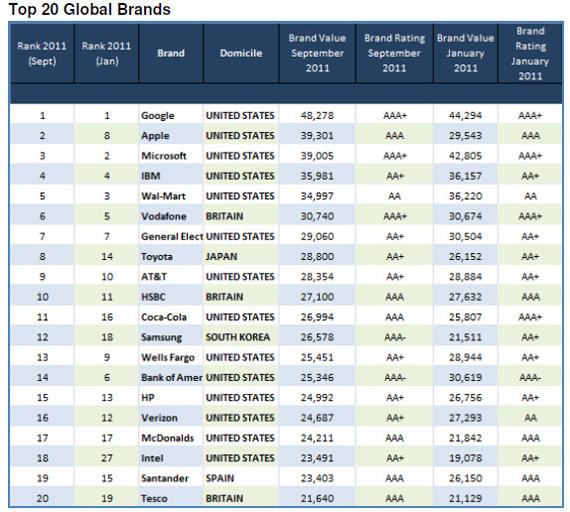 В первую десятку также вошли (места с 4 по 10): IBM, Wal-Mart, Vodafone, General Electric, Toyota, AT&T и HSBC. Таким образом, 7 мест из 10 занимают американские компании, два — британские и одно досталось японцам. Также примечательно, что семь компаний в десятке относятся к сфере высоких технологий.