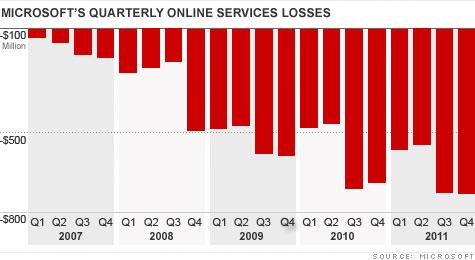 Формально подразделение онлайновых сервисов как обособленная бизнес-единица в Microsoft было запущено в 2007 году и с тех пор суммарный убыток по нему, согласно подсчетам CNN Money, составил 9 млрд долларов. 'Даже хорошие новости, связанные с Bing, не такие хорошие. Microsoft гордо заявляет, что Bing наращивает рыночную долю против Google ежемесячно на протяжении последних 27 месяцев. Эт так, но он набирает долю не за счет ее снижения у Google', - отмечает CNN Money.