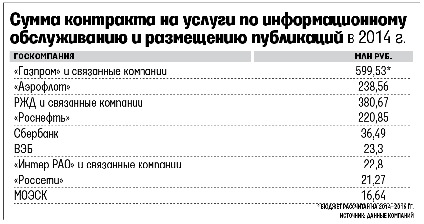 Из данных о госзакупках можно узнать, что сопоставимые с 'Газпромом' и РЖД деньги на СМИ и блогеров готовы потратить'Аэрофлот', 'Роснефть', а другие госкомпании отводят на эти цели более скромные суммы — десятки миллионов рублей (подробнее см. таблицу). Всего же в конце 2013 года и начале 2014 года услуги информационного обеспечения, целью которого является в том числе появление публикаций без пометок 'на правах рекламы', заказали 10 госкомпаний — на общую сумму в 1,5 млрд рублей с лишним.