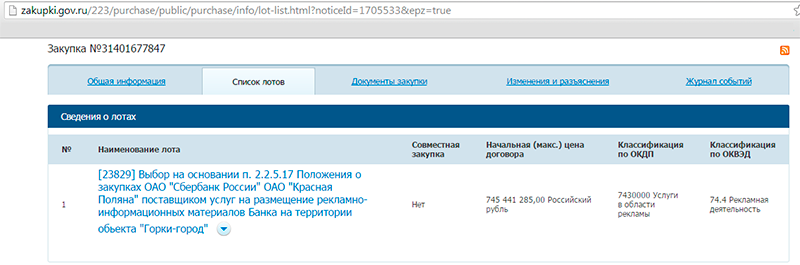 Поскольку при данной закупке использовалась процедура неконкурентного отбора, ОАО «Красная Поляна» стало единственным поставщиком соответствующих услуг. Закупочная документация в сети не размещалась, поэтому неизвестно, что конкретно должно входить в перечень работ. Пресс-служба банка не предоставила подробностей о закупке, отметив только, что подразумевается размещение в наружной рекламе.