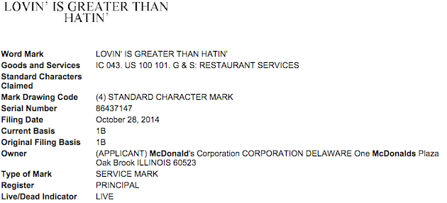 На прошлой неделе The Wall Street Journal со ссылкой на источники сообщила, что McDonald's определились с новым слоганом для своей новой маркетинговой стратегии. Рекламная кампания должна стартовать 1 января 2015 года, а 1 февраля в эфире NBC может быть показан посвященный ей 60-секундный ролик в рамках трансляции Super Bowl XLIX. Новость мгновенно разлетелась по соцсетям, а слоган «Lovin' Beats Hatin'» был встречен пользователями насмешками.
