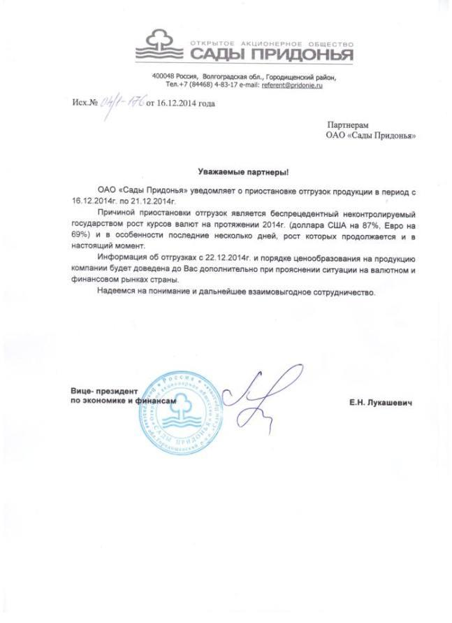 Как сообщает ВолгаПромЭксперт, сегодня предприниматели региона получили официальное письмо за подписью вице-президента по экономике и финансам НПГ «Сады Придонья» о том, что с 16 по 21 декабря 2014 года поставка продукции компании в адрес партнеров приостановлена.