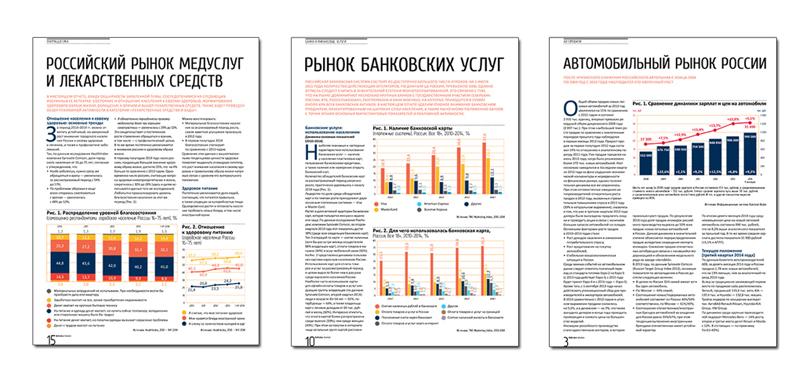 В первом выпуске опубликованы аналитические отчеты по текущей ситуации на российском автомобильном, банковском рынках, а также в сфере медицинских услуг и лекарственных препаратов. В то время как общая динамика российского авторынка демонстрирует продолжающееся падение объемов сбыта по сравнению с прошлым годом, уверенно растет количество обладателей банковских карт и наблюдается плавная тенденция к снижению частоты обращения населения к врачам.
