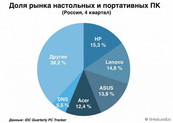 Российский рынок ноутбуков сократился на 40,4% по сравнению с предшествующим годом до 1,02 миллионов устройств, подтверждая тенденцию последнего времени. Тем не менее, четвертый квартал показал значительное падение даже по сравнению с прошлым кварталом. И на продажи компьютеров не смогли повлиять ни декабрьский ажиотаж, ни новогодние праздники. Наибольший объем поставок приходится на долю компании ASUS. Далее следуют Lenovo, Acer, Hewlett-Packard и Apple.