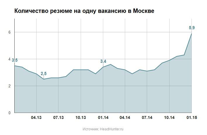 Рекрутеры зафиксировали рост числа резюме при практически неизменном числе вакансий. Это следует из статистических данных порталов HeadHunter (HH) и Superjob, предоставленных РБК. По данным HH, индекс, который характеризует соотношение резюме и вакансий на конец февраля в целом по Москве составлял 5,9, то есть почти шесть резюме на вакансию. Показатель по сравнению с аналогичным периодом прошлых лет вырос более чем в полтора раза (в 2014 году было 3,4, в 2013 году – 3,5). В целом по России на начало февраля соотношение составило 4,2 (в 2014 году – 2,9).