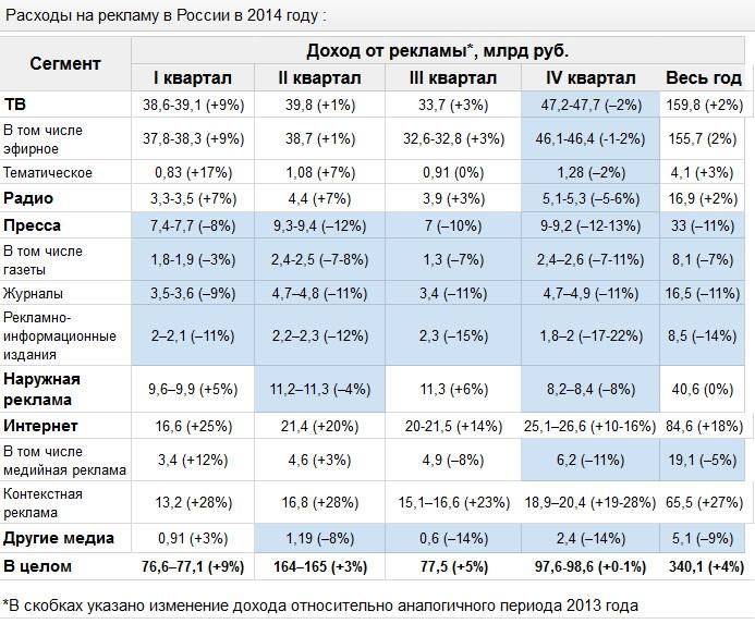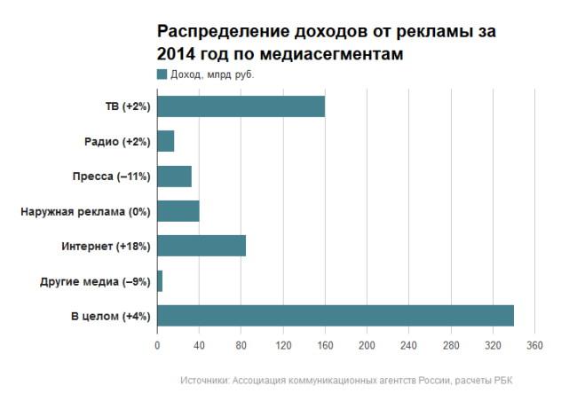 В 2014 году общие расходы на рекламу выросли на 4%, до 340,1 млрд руб. без НДС, объявила в четверг, 26 февраля, Ассоциация коммуникационных агентств России (АКАР). Из ее данных следует, что по итогам всего прошлого года отрицательную динамику продемонстрировали такие медиасегменты, как пресса (снижение рекламных доходов на 11%, до 33 млрд руб.), баннерная интернет-реклама (минус 5%, до 19,1 млрд руб.), так называемая indoor-реклама (реклама внутри торговых и бизнес-центров, внутри аэропортов и железнодорожных вокзалов и т.п.; минус 6%, до 4,1 млрд руб.) и реклама внутри кинотеатров (минус 20%, до 1 млрд руб.).