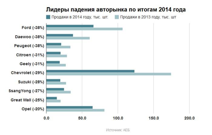 Главными аутсайдерами месяца стали такие бренды, как Honda, Opel, Peugeot, Citroen и Ford. Продажи автомобилей Honda рухнули сразу в десять раз – с 2,5 тыс. штук в феврале 2014 года до 252 машин в феврале 2015 года. Немногим лучше оказались результаты остальных «мэтров»: месячные продажи Opel упали на 86% (с 6,6 тыс. до 912 штук), Peugeot – на 84% (с 2,4 тыс. до 377), Citroen – на 83% (с 2,2 тыс. до 380), Ford – на 78% (с 6,3 тыс. до 1,4 тыс.).