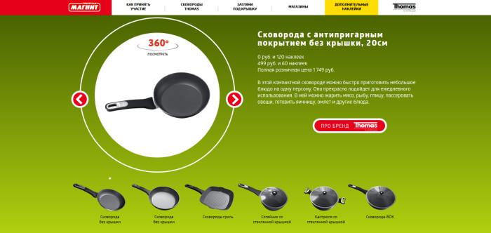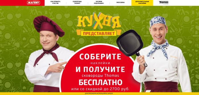 Совершая покупки до 6 сентября 2015 года включительно в магазинах «Магнит» покупатели будут получать наклейки, которые затем смогут обменять на фирменные сковороды бесплатно или приобрести их со значительной скидкой. Акция проводится в 4850 магазинах сети.
