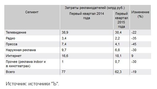 Российский рекламный рынок в первом квартале 2015 года сократился на 19%, до 62,3 млрд руб., свидетельствуют предварительные данные рекламных агентств