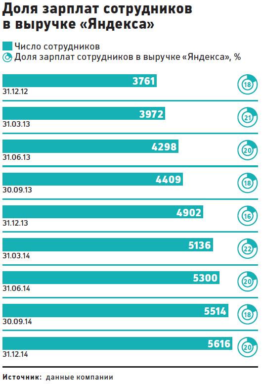 Компания неоднократно заявляла, что намерена держать планку этих затрат на уровне 20% выручки: например, гендиректор российского офиса «Яндекса» Александр Шульгин говорил об этом аналитикам в рамках конференц-колла по итогам первого квартала 2014 года. Выручка «Яндекса» в 2015-м должна увеличиться по сравнению с предыдущим годом на 11,6%, до 55,9 млрд руб. с 50,8 млрд руб., прогнозировали в феврале аналитики Райффайзенбанка. В таком случае расходы на персонал могут составить около 11,2 млрд руб.