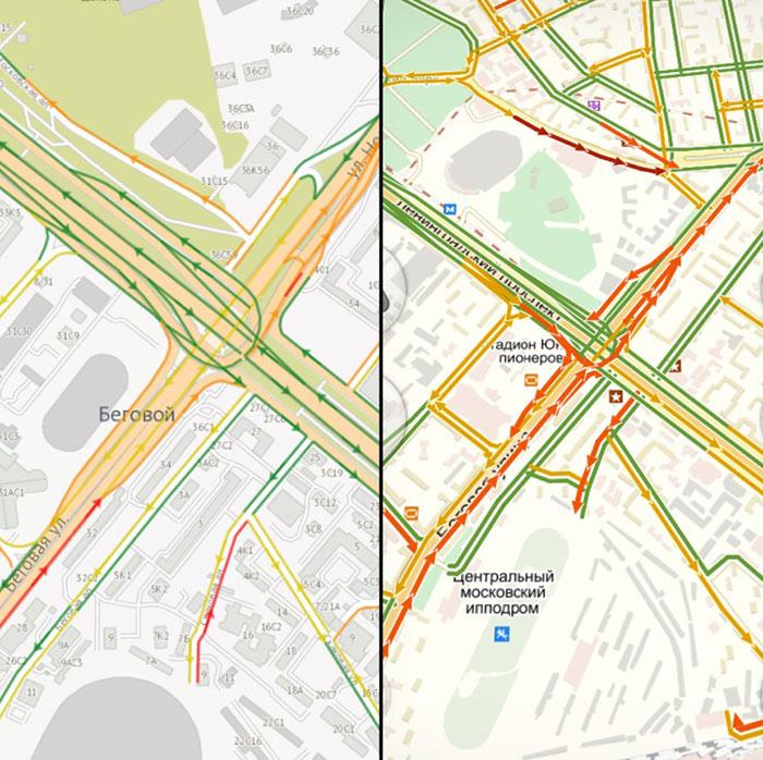 Сравнение ТТК в районе метро «Беговая» по данным на 15:00 мск. Слева показатели приложения «Электронный атлас», справа — «Яндекс.Пробки»
