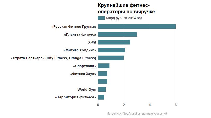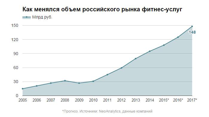В 2014-м объем рынка, по данным NeoAnalytics, составил около 95 млрд руб. Аналитики компании прогнозируют, что общее количество фитнес-клубов в России в ближайшее время будет сокращаться. Всего в России сейчас насчитывается около 3,7 тыс. компаний, оказывающих фитнес-услуги, включая сетевые и одиночные фитнес-клубы, отмечают они.