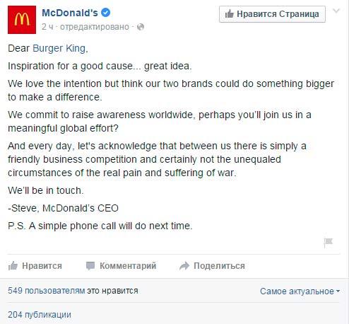 Компания 26 августа разместила в New York Times и Chicago Tribune рекламу, в которой обратилась к своему главному конкуренту. McDonalds ответил в Facebook