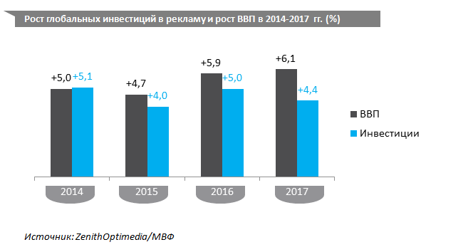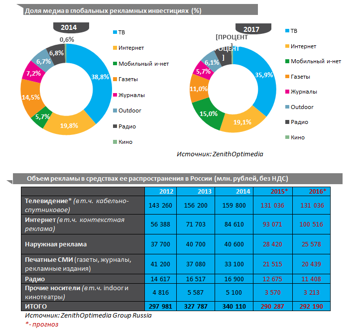 Из всех медиа расти продолжит лишь интернет — на 10% в этом году и на 8% — в будущем году. Из подсчетов агентства следует, что доля интернета в общих затратах на рекламу в этом году составит 32% (у телевидения — 45%). А в будущем году на интернет будет приходиться уже 34% всех затрат. На мировом уровне доля интернета растет быстрее: в 2017 году она составит 34%, доля телевидения — 35,9%. Как полагает ZenithOptimedia, в 2018 году интернет превзойдет телевидение и станет первым в мире медиа по размеру рекламных инвестиций.