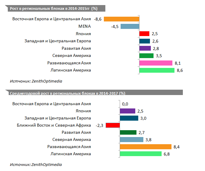 На рынок рекламы негативно влияют падение цен на нефть, стагнация экономики, санкции со стороны Европы и США и контрмеры, поскольку крупнейшие рекламодатели на российском рынке — западные компании. Но во втором квартале 2015 года ситуация стабилизировалась, в связи с чем прогноз и улучшен, объясняют эксперты ZenithOptimedia. Критичных изменений в составе крупных рекламодателей не произошло, большинство производителей организовали локальные производства и предлагают товары разных ценовых сегментов, а значит, имеют возможности для их продвижения. В связи с этим агентство заключает, что у российского рекламного рынка впереди хорошие перспективы, а индустрия адаптируется к экономической ситуации.