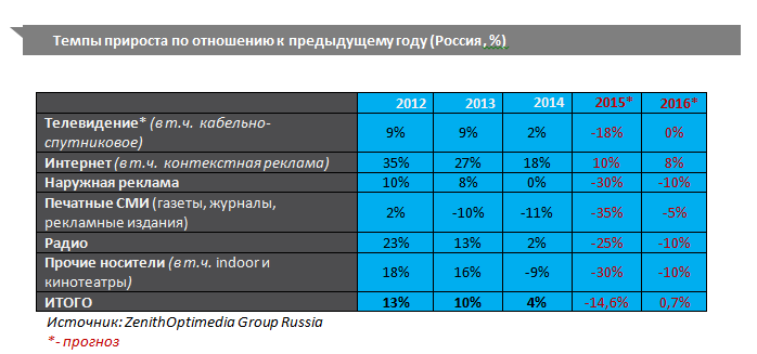 Затраты на телерекламу в этому году упадут на 18%, до 131 млрд руб. В будущем году ZenithOptimedia предрекает нулевой рост этого сегмента (см. подробнее таблицу). Радиореклама потеряет 25% в этом году и 10% в следующем, составив 11,4 млрд руб. Рынок наружной рекламы сократится на 30% в этом году, а в будущем году на 10%, до 25,6 млрд руб. Самое сильное падение в 2015 году, по версии ZenithOptimedia, переживет печатная пресса, рекламная выручка которой упадет на 35%, до 21,5 млрд руб.; в следующем году этот сегмент упадет на 5%.