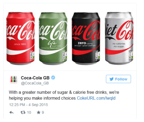 Coca-Cola решила выделить свою линейку низкокалорийной газировки и напитков с пониженным содержанием сахара, запустив рекламную кампанию через несколько часов после выхода документальной передачи Джейми Оливера на канале Channel 4, в которой он объявил «окончательную войну» сахару.