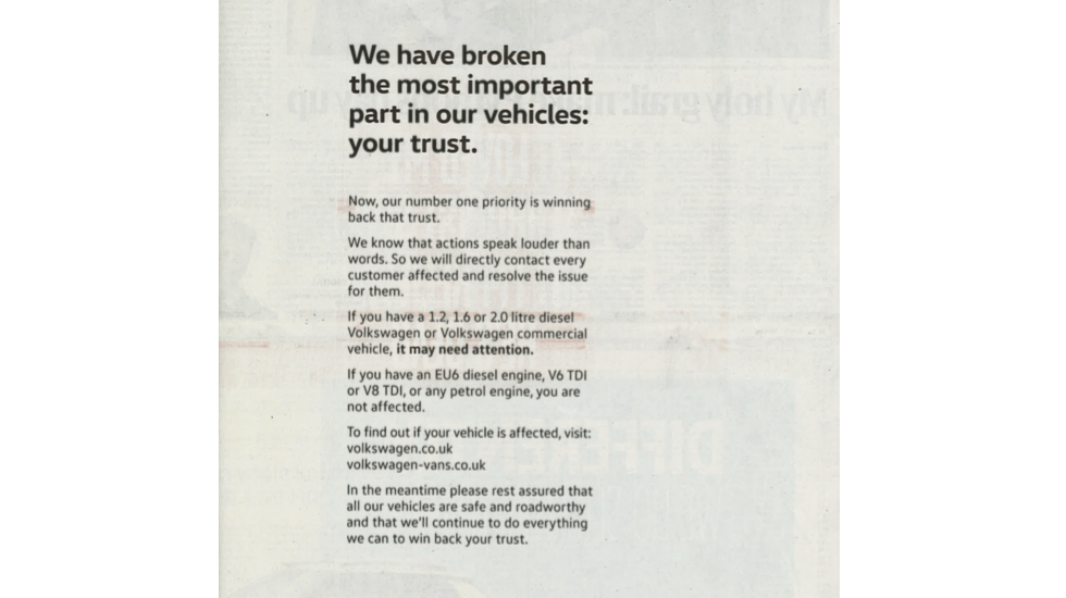 В минувшие выходные сразу несколько национальных газет Великобритании вышли с рекламными объявлениями от Volkswagen. Заголовок гласил: «Мы разбили самую важную часть наших автомобилей – ваше доверие. Мы знаем, что действия говорят лучше слов, поэтому планируем связаться с каждым пострадавшим клиентом».