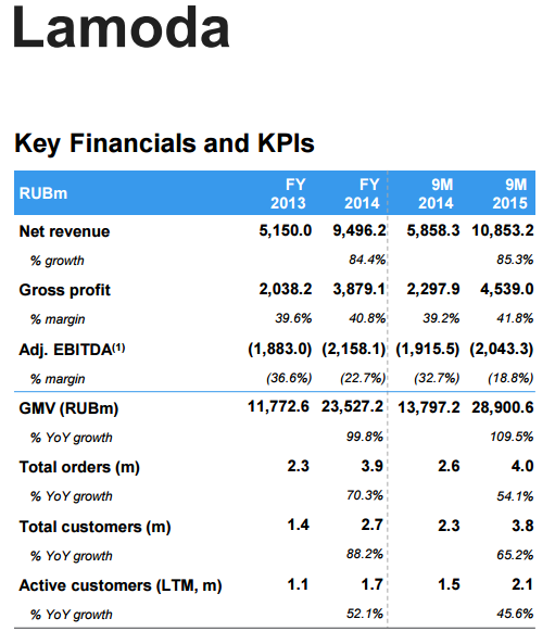 Немецкая компания Rocket Internet, владеющая российским интернет-магазином одежды Lamoda, представила отчет по своим бизнесам за девять месяцев 2015 года. Выручка увеличилась почти в два раза, однако операционный убыток тоже вырос