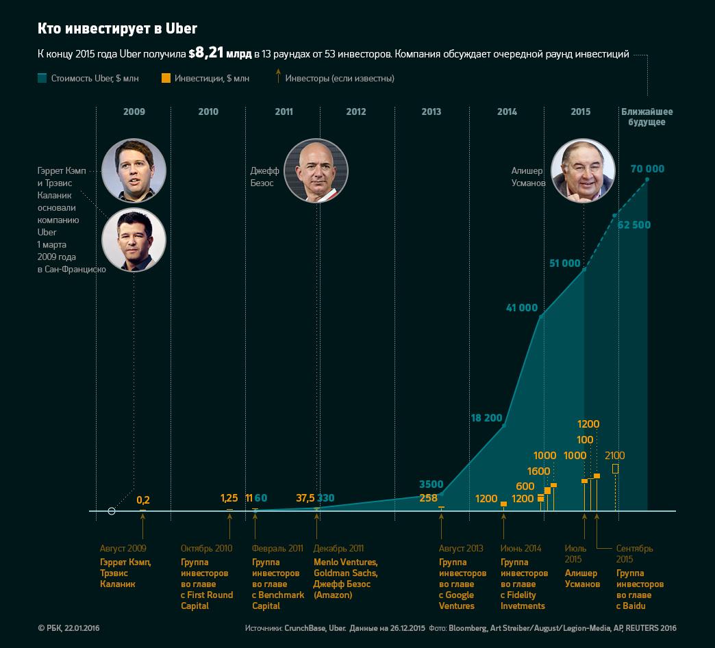 Последний раунд инвестиций в Uber состоялся в декабре прошлого года, писал Bloomberg. Компания привлекла $2,1 млрд от Tiger Global Management, T.Rowe Price и других инвесторов, которые оценили весь бизнес компании в $62,5 млрд. USM в этом раунде участия не принимал, говорит источник РБК, близкий к холдингу. Таким образом, только последние инвестиции Усманова в Uber с лета прошлого года подорожали на 22,5%. Сервис Uber возглавляет топ самых дорогих стартапов мира.