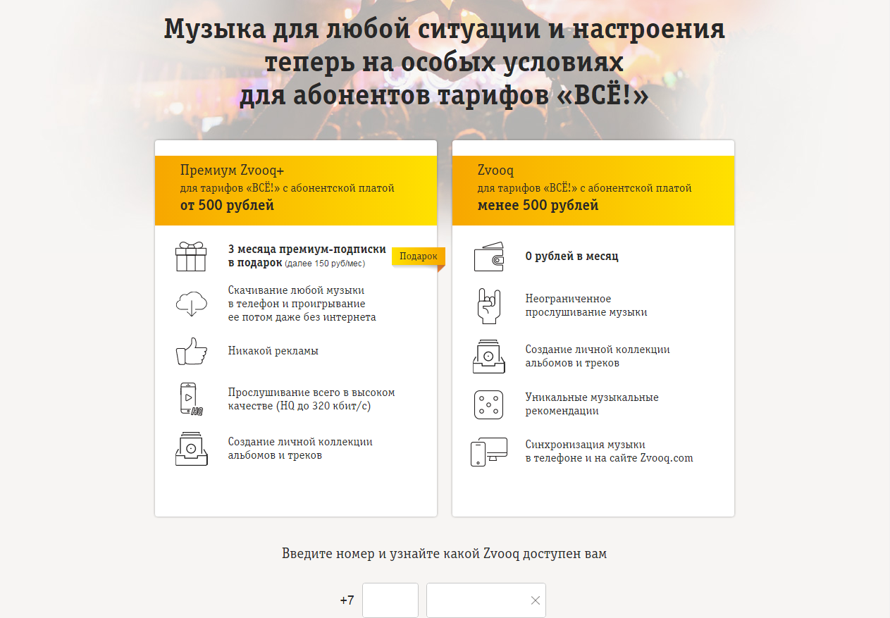 Абоненты тарифной линейки «Все!» смогут подключиться к музыкальному сервису на промостранице zvooq.beeline.ru и получить доступ к более чем 25 миллионам треков. Для этого необходимо ввести номер телефона и получить премиум-подписку Zvooq+, бесплатный доступ к которой будет действовать в течение трех месяцев. По истечении этого периода ее стоимость составит 150 рублей в месяц с учетом скидки.
