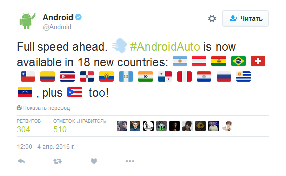 «Вперед на полной скорости. Android Auto теперь доступна еще в 18 странах», – говорится в сообщении компании на официальной странице в Twitter.