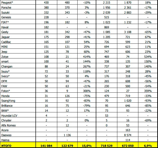 Продажи легких коммерческих автомобилей включены в общие цифры продаж по брендам и маркам, если присутствуют в продуктовой линейке (отмечены *); указаны отдельно по некоторым маркам. LCV<3,5т (в отдельных исключениях масса достигает верхнего предела 6т). Возможны незначительные корректировки данных по легкой коммерческой технике.