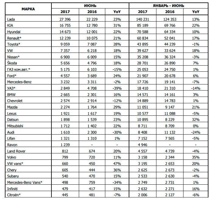 Продажи новых легковых и легких коммерческих автомобилей в России по маркам за периоды июнь 2017/2016 гг. И январь – июнь 2017/2016 гг.