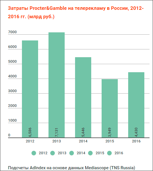 P&G, которой принадлежат такие бренды как Fairy, Pampers и Tide, снизила свои рекламные расходы примерно на $1 млрд с 2013 г. Тогда рекламный бюджет компании составлял $8,19 млрд. В 2014 г. он упал до $7,87, в 2015-ом – до 7,18 млрд, в 2016-ом подрос до $7,24, а в текущем году опять снизился до $7,12.