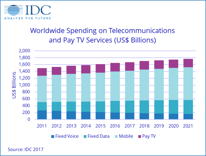В 2018 году рост продолжится, глобальные расходы на услуги связи и платное телевидение увеличатся еще на 2% и превысят $1,7 трлн.
