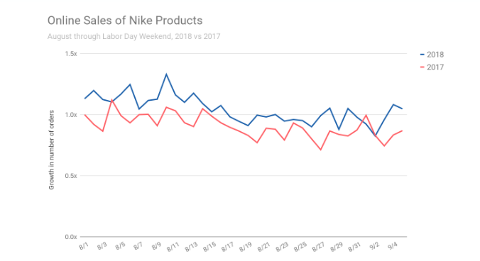 Онлайн-продажи Nike выросли на 31% со 2 по 4 сентября 2018 г., передает AdAge со ссылкой на отчет исследовательской компании Edison Trends. В прошлом году за этот же период показатель вырос на 17%.