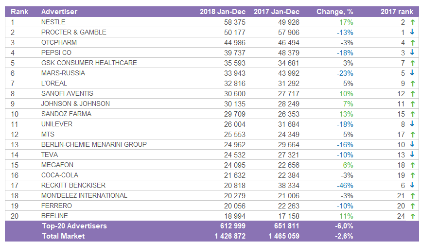Новыми участниками топ-20 крупнейших ТВ-рекламодателей в 2018 г. стали бренд «Билайн» (принадлежит компании «Вымпелком»), который нарастил закупки рекламы на ТВ на 11%, и компания Mondelēz (Alpen Gold, Dirol, Halls, Milka), хотя она и закупила на 3% меньше GRP, чем в 2017 г. Из двадцатки выбыли Danone (бренды «Активиа», «Даниссимо», «Простоквашино») и Henkel Group (Losk, Schwarzkopf, Syoss).
