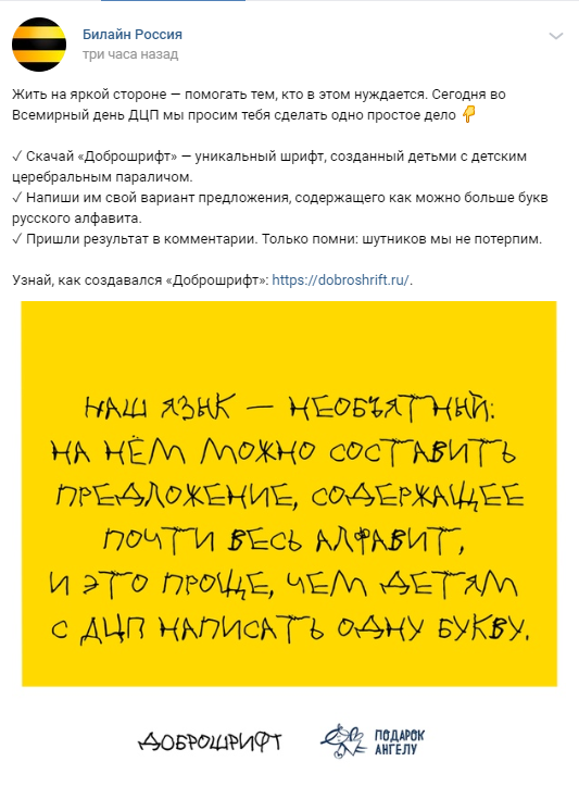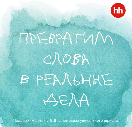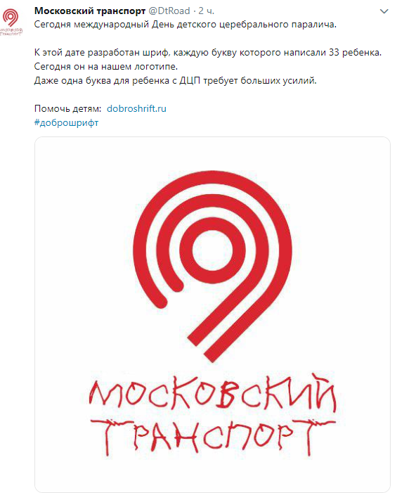 Российские бренды присоединились к акции к Международному дню церебрального паралича (ДЦП). Интернет-сервисы, онлайн-магазины, банки и СМИ изменили свои логотипы и слоганы, перепечатав их «доброшрифтом» — он создан из букв, которые написали дети с заболеванием центральной нервной системы. Также бренды призвали скачать «доброшрифт», сделав пожертвование на сайте проекта.