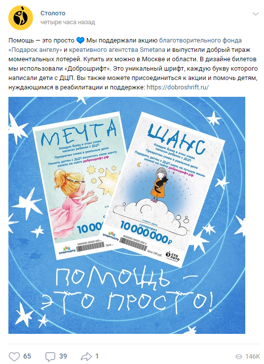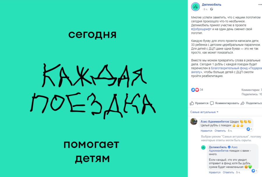 Некоторые бренды не только поддержали проект «Доброшрифт», но и запустили собственную акцию. Например, каршеринг-сервис «Делимобиль» 2 октября перечислит 1 руб. с каждой поездки в благотворительный фонд «Подарок ангелу».