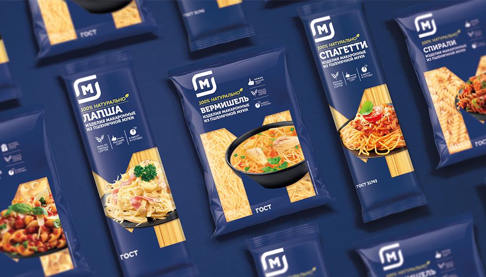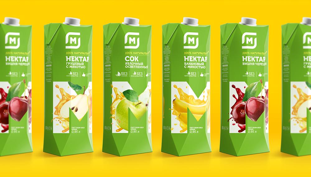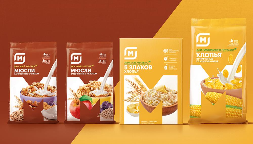 Дизайн упаковки сохраняет фирменный знак розничной сети (букву «М») и является стилеобразующим для всего ассортимента. Акцент при этом делается на изображении продукта, интегрированного в фирменный знак.