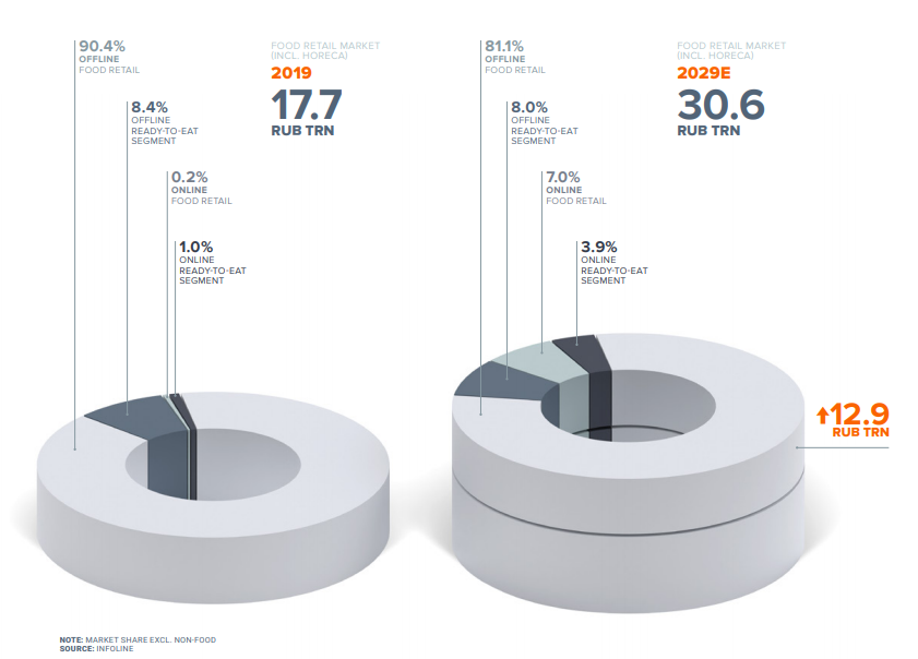 Сегмент электронной коммерции будет расти. По оценке Infoline, в 2019 г. объем рынка продуктовой розницы (включая HoReCa) составил 17,7 трлн руб. Большая часть (90,4%) пришлась на офлайн-розницу 8,4% — на сегмент готовой еды, тогда как доля онлайн-каналов составила всего 0,2% у продуктов и 1% — у готовой еды. Согласно прогнозам, к 2029 г. соотношение изменится: доля онлайн-розницы увеличится до 7%, интернет-продаж готовой еды — до 3,9%, а вклад обычной розницы сократится до 81,1%.