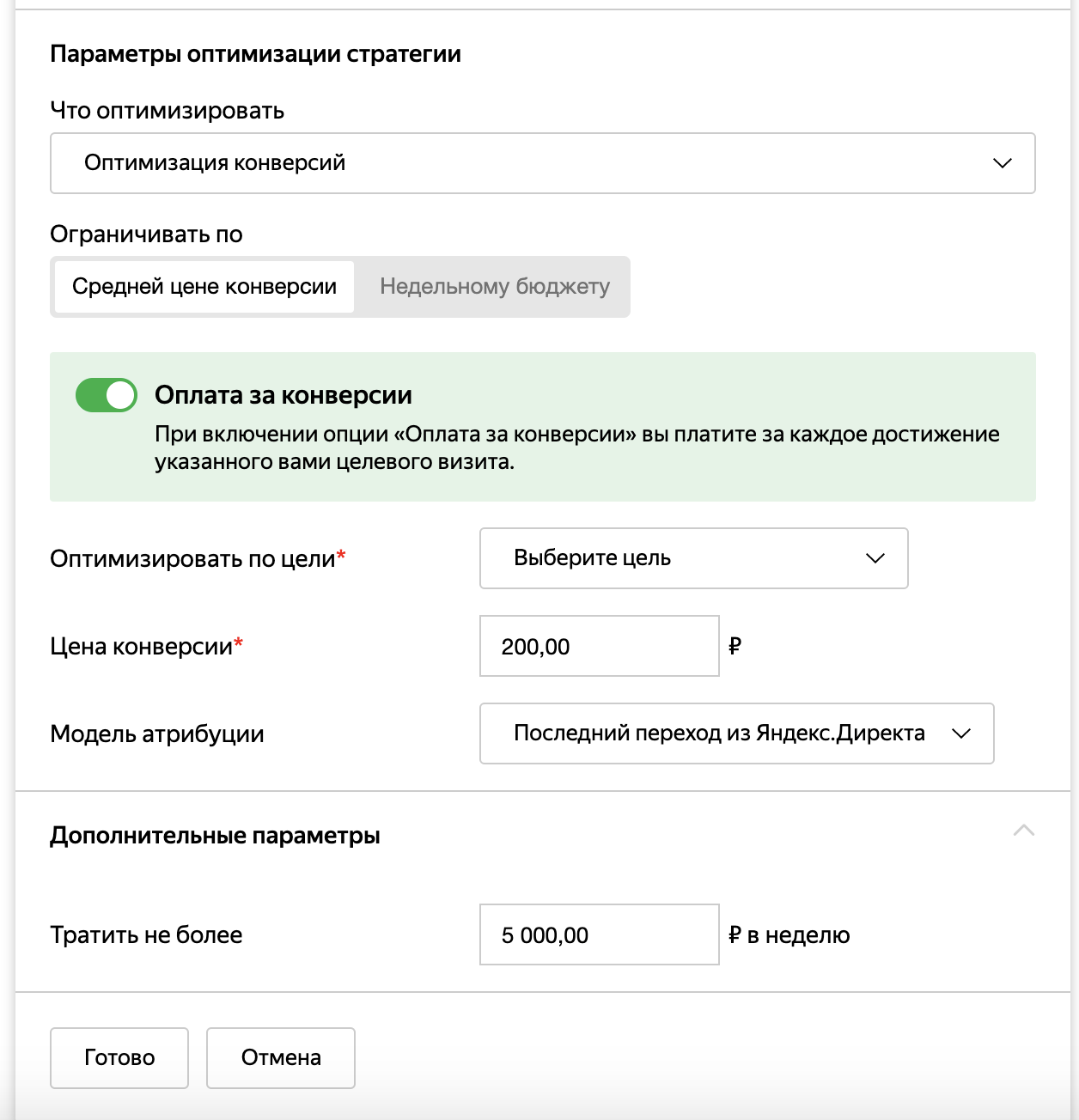 Включить или выключить «Оплату за конверсии» можно только в интерфейсе «Директа». В дальнейшем редактировать настройки стратегии можно будет с помощью API или «Директ.Коммандера».
