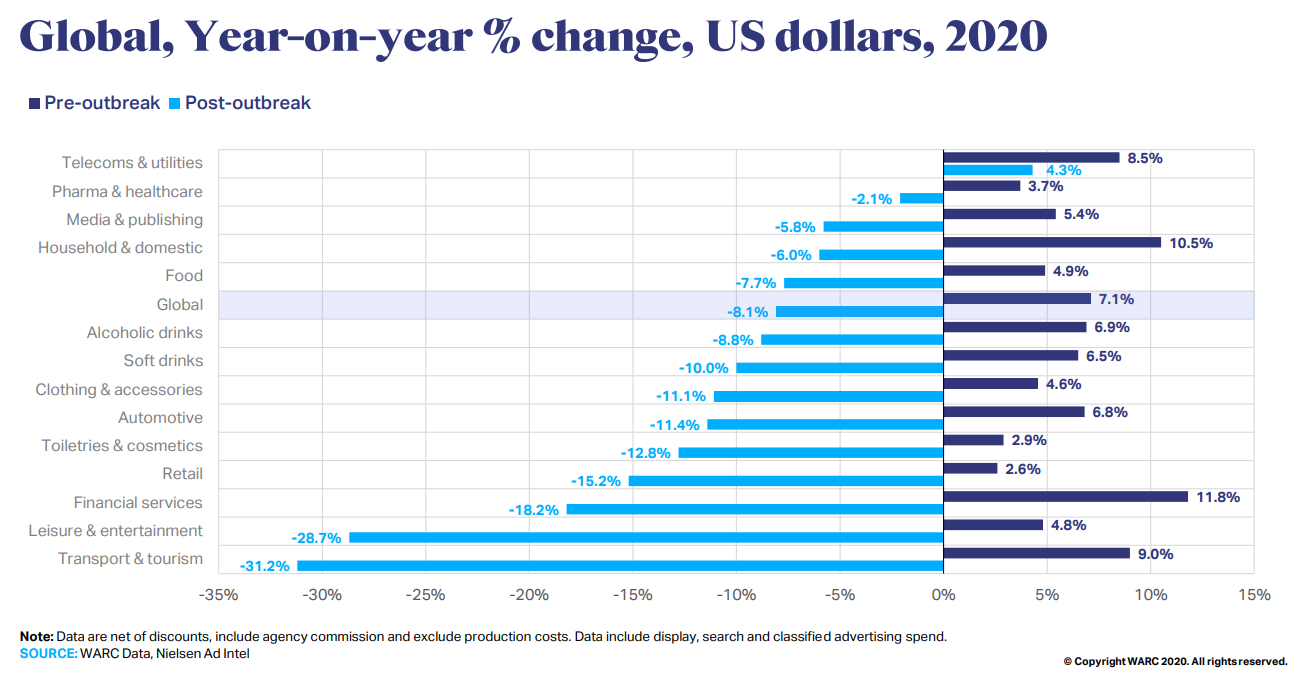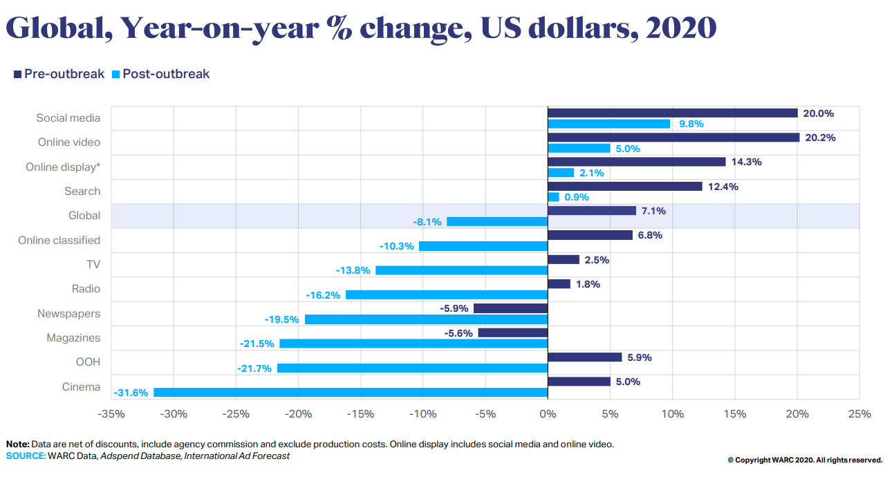 Вспышка коронавируса и сопутствующие ограничения негативно отразились на всех сегментах рекламы. До начала эпидемии, прогноз на 2020 г. предполагал, что сокращение бюджетов будет зафиксировано только на рекламу в печатных газетах и журналах. После начала пандемии компания скорректировала ожидания от рынка — по итогам года вырастут только расходы на продвижение в соцсетях, онлайн-видео, на дисплеях и в поиске.