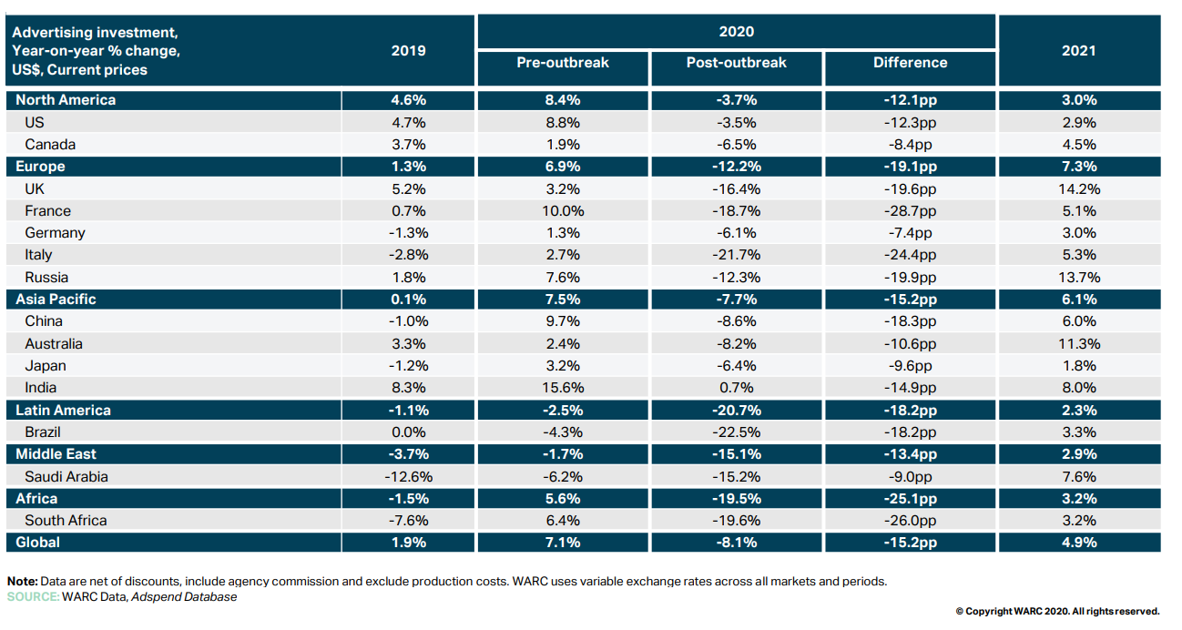 Исследовательская компания Warc опубликовала глобальный прогноз по рекламному рынку на 2020 и 2021 г. В прогнозе представлены данные и по России.
