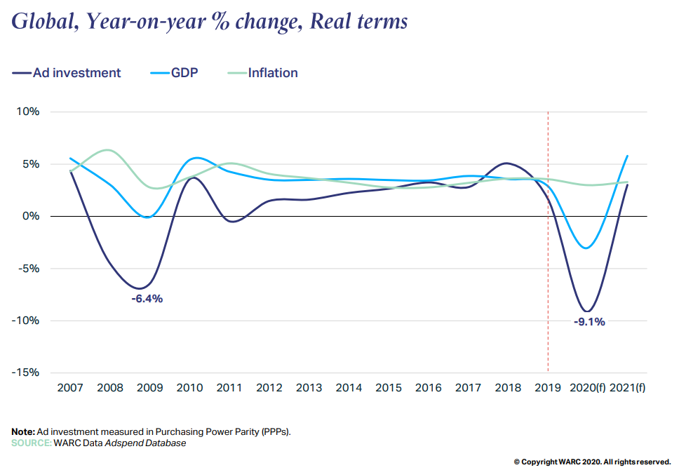 На глобальном уровне рекламный рынок упадет на 8,1% до $49,6 млрд, причем динамика будет отрицательной для всех регионов мира. Однако показатель не опустится ниже результатов 2009 г., когда расходы на рекламу сократились на 12,7%. Такой прогноз был получен по итогам анализа данных от партнеров Warc в 96 странах и сведений от таких компаний, как Nielsen и Intel.