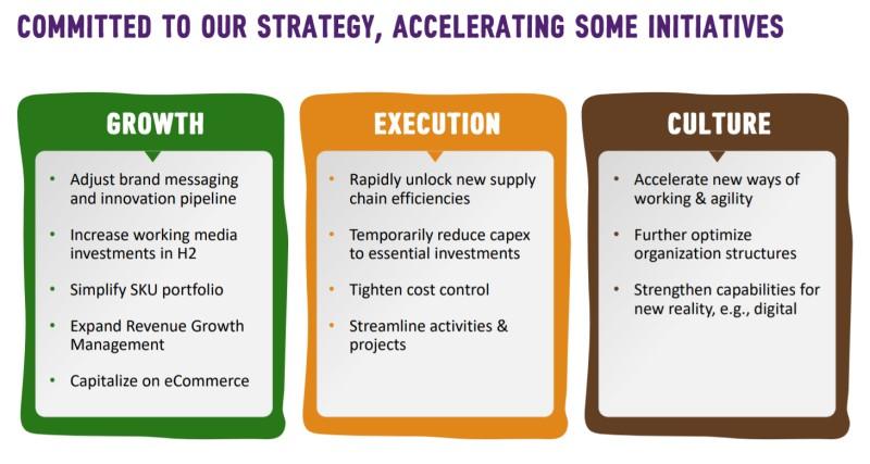 Компания жестко контролирует все расходы, сокращая операционные издержки там, где это возможно. Антикризисная стратегия подразумевает и корректировку маркетинговой активности. Mondelēz планирует сделать свои промо более адресными, упростить ассортимент (заметно сократить число SKU), сделав ставку на самые сильные бренды и отказавшись от запуска новинок, а также значительно увеличить инвестиции в работающие медиа во втором полугодии. Кроме того, производитель Oreo и Milka намерен развивать e-commerce, поскольку люди все больше покупают онлайн. Целью усилий, которые Ван де Пут назвал «атакой на рынок», является увеличение рыночной доли.