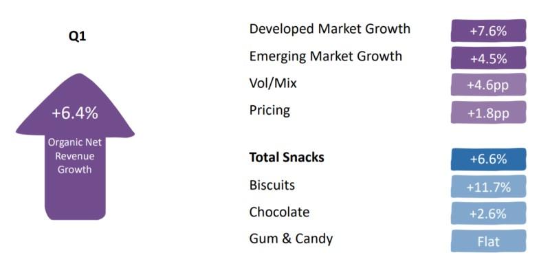 Согласно презентации, органический рост квартальной выручки составил 6,4%. Продажи снеков в целом выросли на 6,6%, печенья — на 11,7%, шоколада — на 2,6%. Категория «Конфеты и жевательная резинка» показала нулевую динамику.