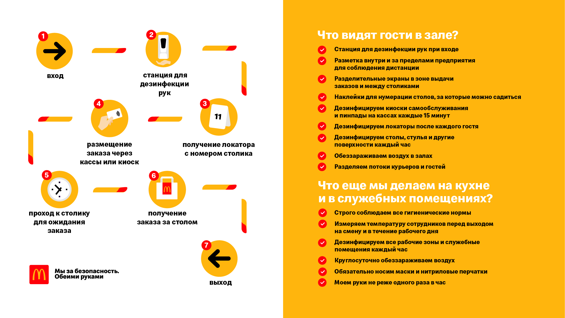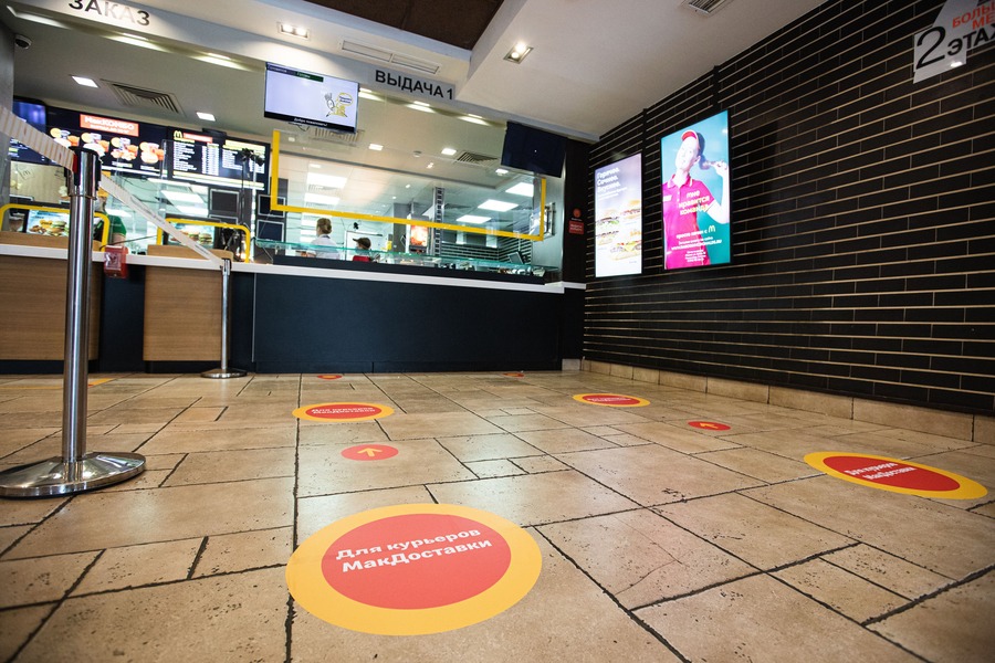При входе в McDonald’s посетителям предложат продезинфицировать руки на оборудованной станции, затем они получат локатор с номером стола, где будут ожидать свои заказы, в том числе навынос. Покупки клиенты McDonald’s получат бесконтактно: сотрудник заведения поставит заказ на соседний незанятый стол. Между посадочными местами и терминалами самообслуживания установят защитные экраны.