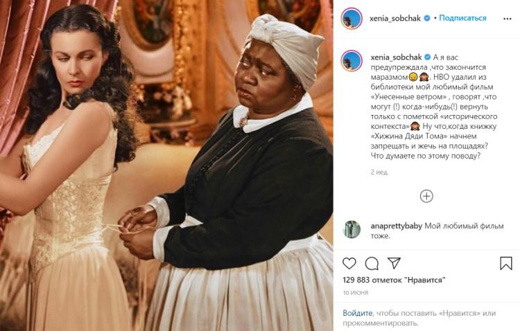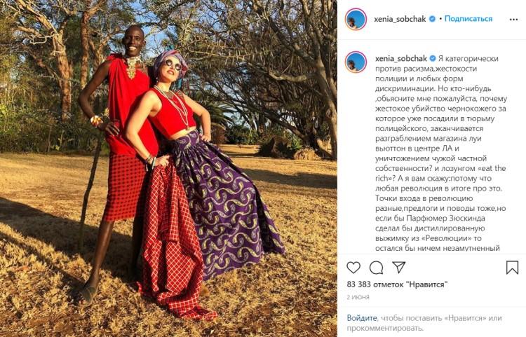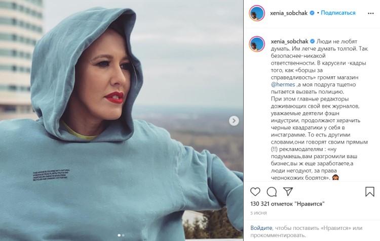 Business Insider приводит примеры постов Собчак в Instagram, где она комментировала действия протестующих под лозунгом Black Lives Matter. В частности, она написала: «То, что происходит сейчас в Америке — это лишнее доказательство, что сколько людям не давай свободы и прав — если эти люди неуспешны, они всегда найдут на кого свалить свой неуспех… И вот уже сегодняшние белые талантливые парни, которые не поступят в Лигу Плюща только потому, что там есть специальные «квоты» для черных».