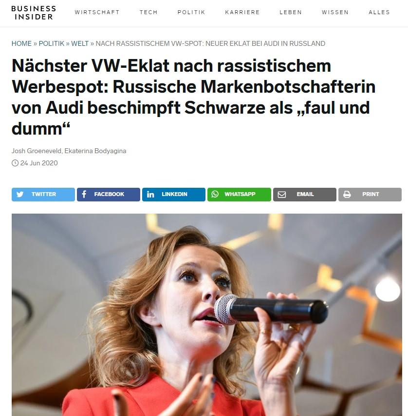 После выхода публикации Audi разорвал контракт с Собчак, которая на протяжении восьми лет являлась послом автомобильного бренда в России. «Известные нам инциденты являются неприемлемыми», — слова представителя Audi Вернера Нойхольда цитирует Deutsche Welle.