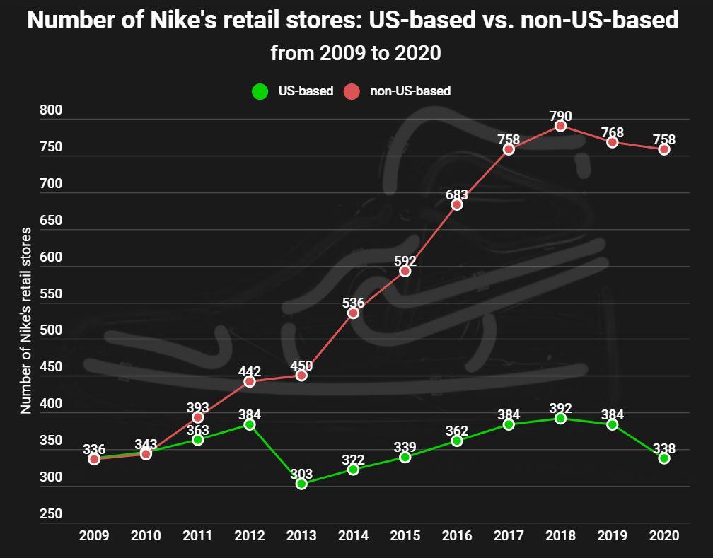 В прошлом году выручка Nike составила $39,1 млрд, в этом году из-за пандемии доходы компании снизились на 4,35% до $37,4 млрд (SafeBettingSites указывает данные за период, закончившийся в июле). Сеть магазинов сократилась на 5%: бренд закрыл 46 точек в США и 10 в других странах. Наибольшего размаха розница Nike достигла в 2018 г., когда у него было 392 магазина в США и 790 магазинов за пределами Штатов. Сейчас это число составляет 338 и 758 соответственно.