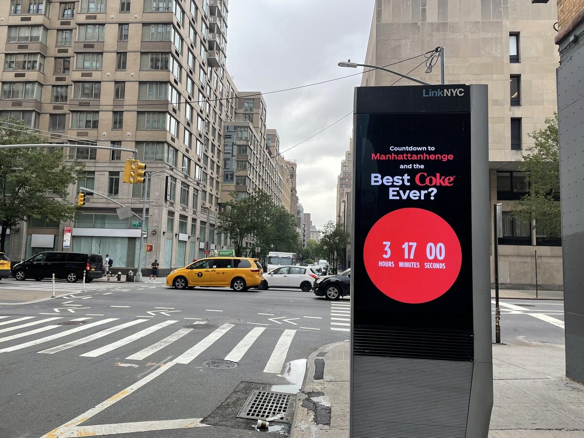 Манхэттенхендж очень любим жителями и гостями города, которые стремятсясделать красивые фотографии на закате. В этот момент и пролетел самолет сбаннером Best Coke Ever?