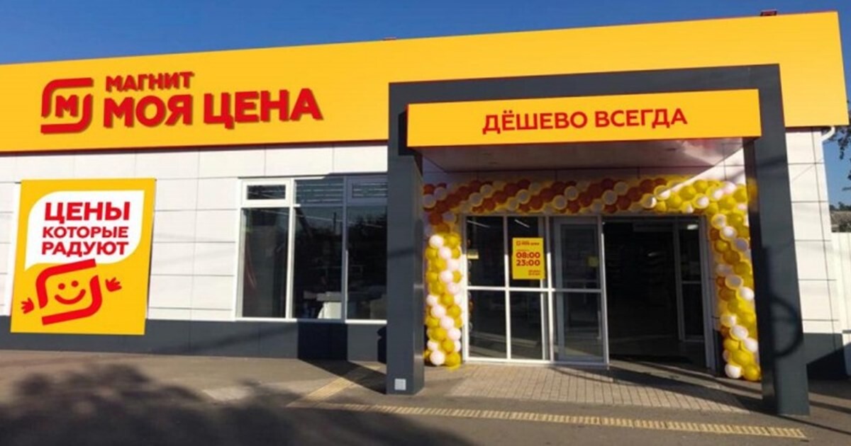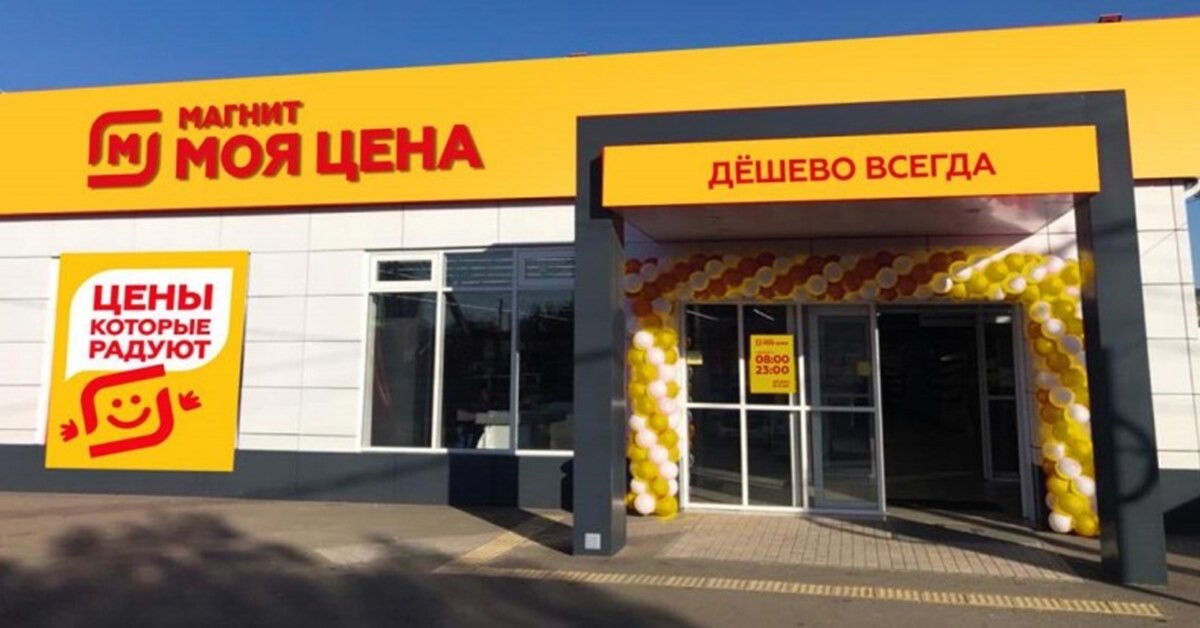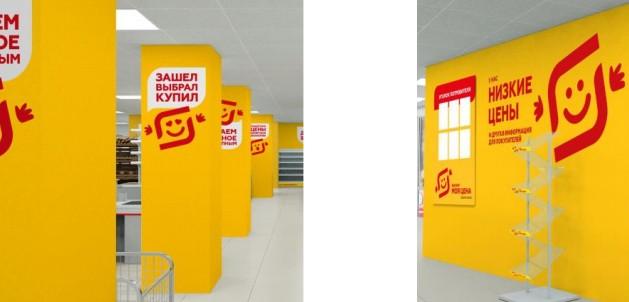 Красной надписью на желтом фоне «Моя цена» должна кардинально отличаться от остальных «магазинов у дома». В оформлении появится стилизованный под логотип «Магнита» смайлик