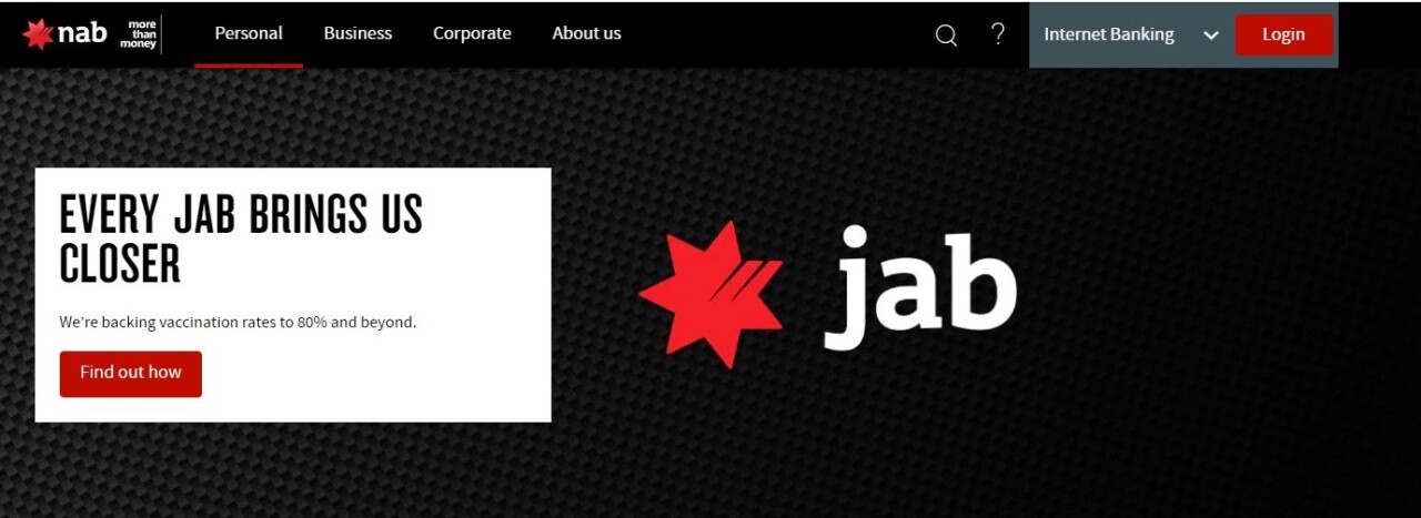 Банк сменил наименование с NAB на JAB, которое созвучно со слоганом кампании«Go jab!» — «Сделай прививку!». «В национальном плане кабинета министровуказано, что после вакцинации 80% взрослых жителей страна будет свободна отвнутренних ограничений. Нам нужна надежда», — указано в заявлениигендиректора.